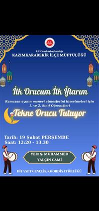 Kazımkarabekir ilçe müftülüğümüze bağlı 4-6 yaş Kur'an Kursumuzda eğitim gören öğrencilerimizin ilk orucum ilk iftarım Ramazan ayının manevi atmosferini hissetmeleri için "TEKNE ORUCU TUTUYOR" 19 ŞUBAT 2026 tarihinde saat :12.20-13.30 arasında Şehit Muhammet YALÇIN Camisinde hediye takdimi ve küçük minik yavrularımız oruçlarını açacaklardır.